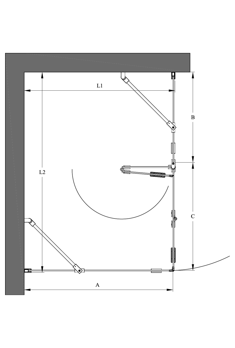 Installation dimensions mean the location of the outermost side of the wall mountedprofile on the building wall measured from the corner of the shower area. The width of the side of the wall mountedprofile placed against the building wall is 22mm. The dimensions may deviate from the declared values if the adjustment range must be used to level the tilt of the walls. Note! The parts of the shower enclosure may also be installed in the opposite direction than presented in the layout.: