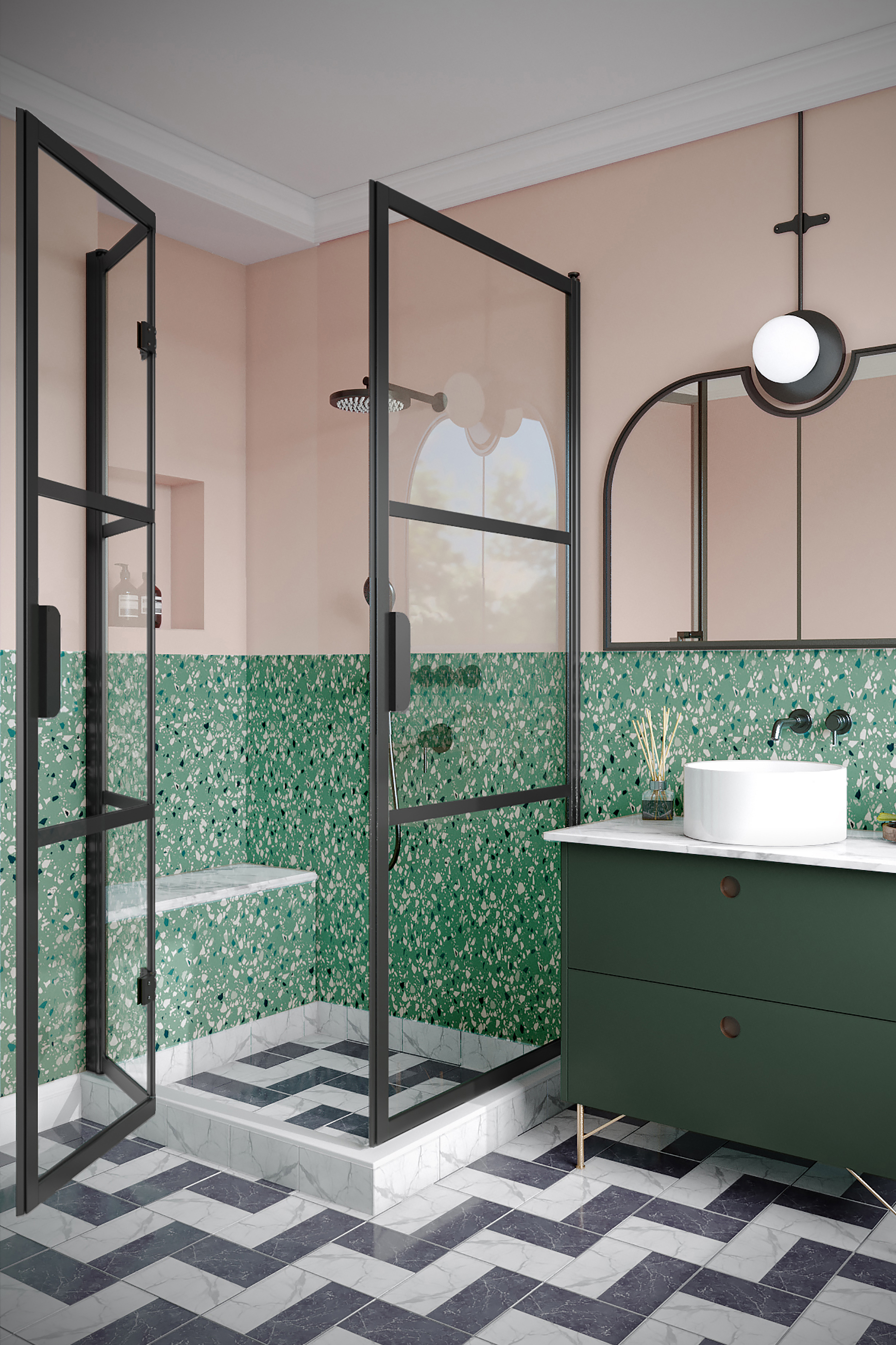 The size of the shower corner can be selected from the standard sizes or it can be manufactured based on special dimensions. The wall mounted profiles have an adjustment tolerance 15mm. The adjustment tolerance may be used for levelling the tilt of the building s walls or for extending the widths of the sides of the shower enclosure in relation to the provided standard dimensions. The widths of one or both sides can be further extended by 34 mm via the extension profile (optional accessory). The extension profile can be grooved, for example, for the inlet of the surface water pipes.