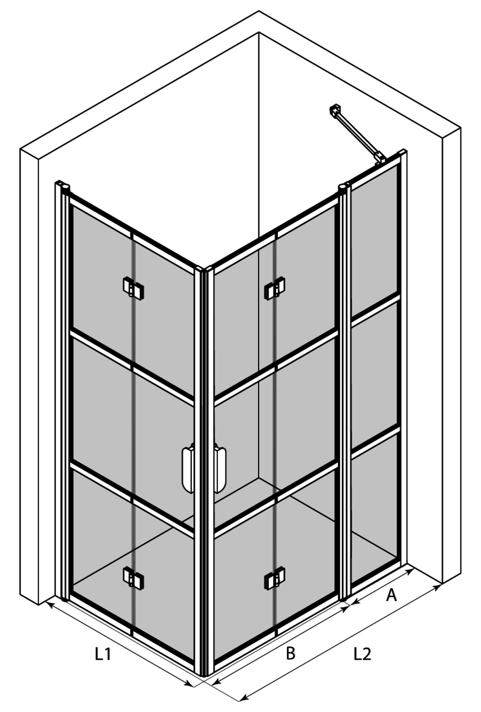 The size of the shower corner can be selected from among the standard sizes or it can be manufactured custom dimensions. The adjustment range of the wall mounted profile of the fixed part is 7mm and that of the door, 15mm, respectively. The adjustment range can be used for levelling of any tilt of the building s walls or for extending the widths of the sides of the shower enclosure in relation to the provided standard dimensions. The widths of one or both sides can be further extended by 34mm(door), 40mmm(fixed panel) via the extension profile (optional accessory). The extension profile can be grooved, for example, for the inlet of the surface water pipes. The fixed panel is mounted with tuning leg by default which is suitable for tilted floors in the case of even floor the floor mounted option can be selected.
