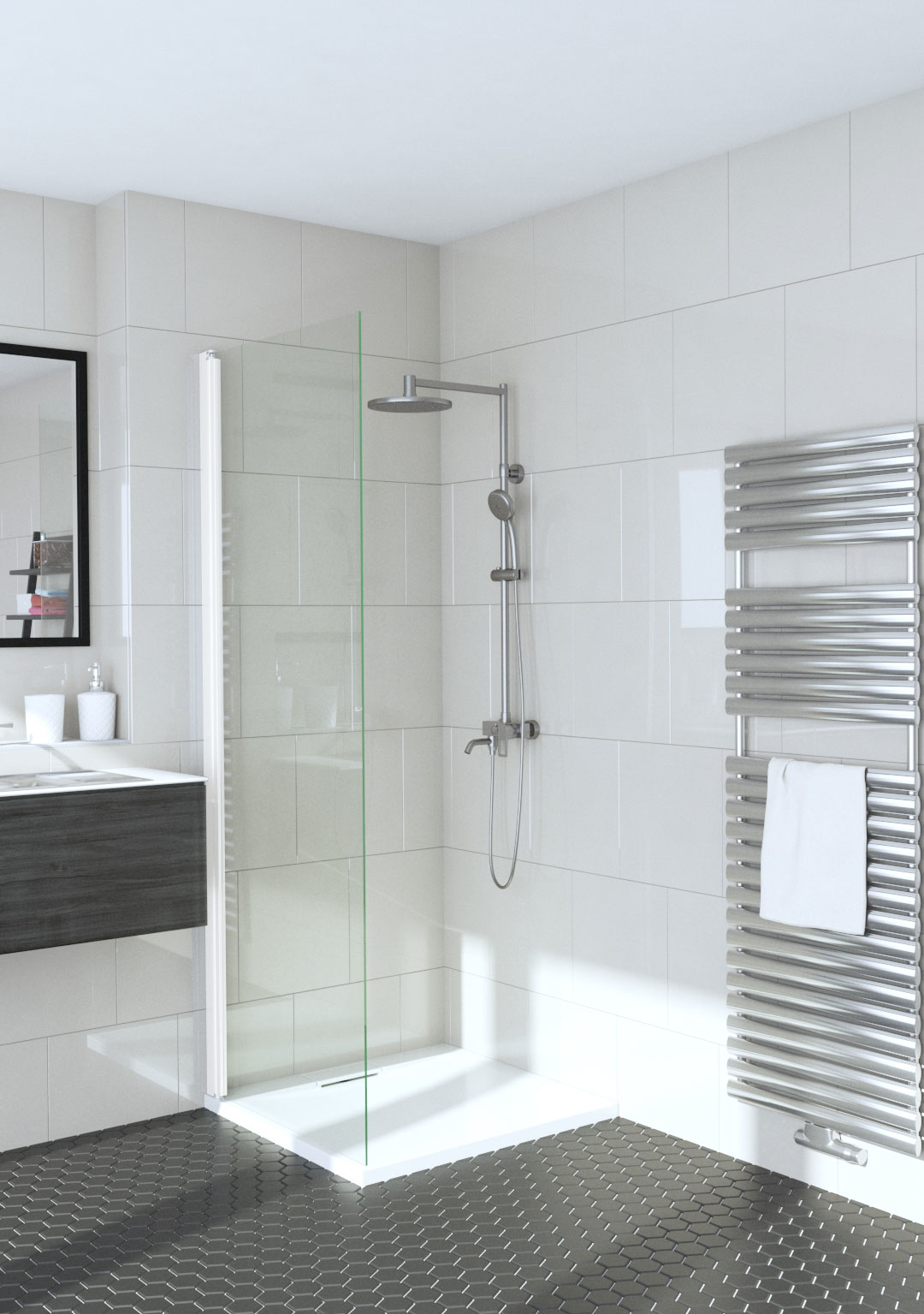 The shower screen is attached to the building wall with a wall mountedprofile. The installation height is freely selectable. By installing the product close to the floor and installing a floor seal along the bottom edge of the panel the flow of water can be restricted. Installation guide