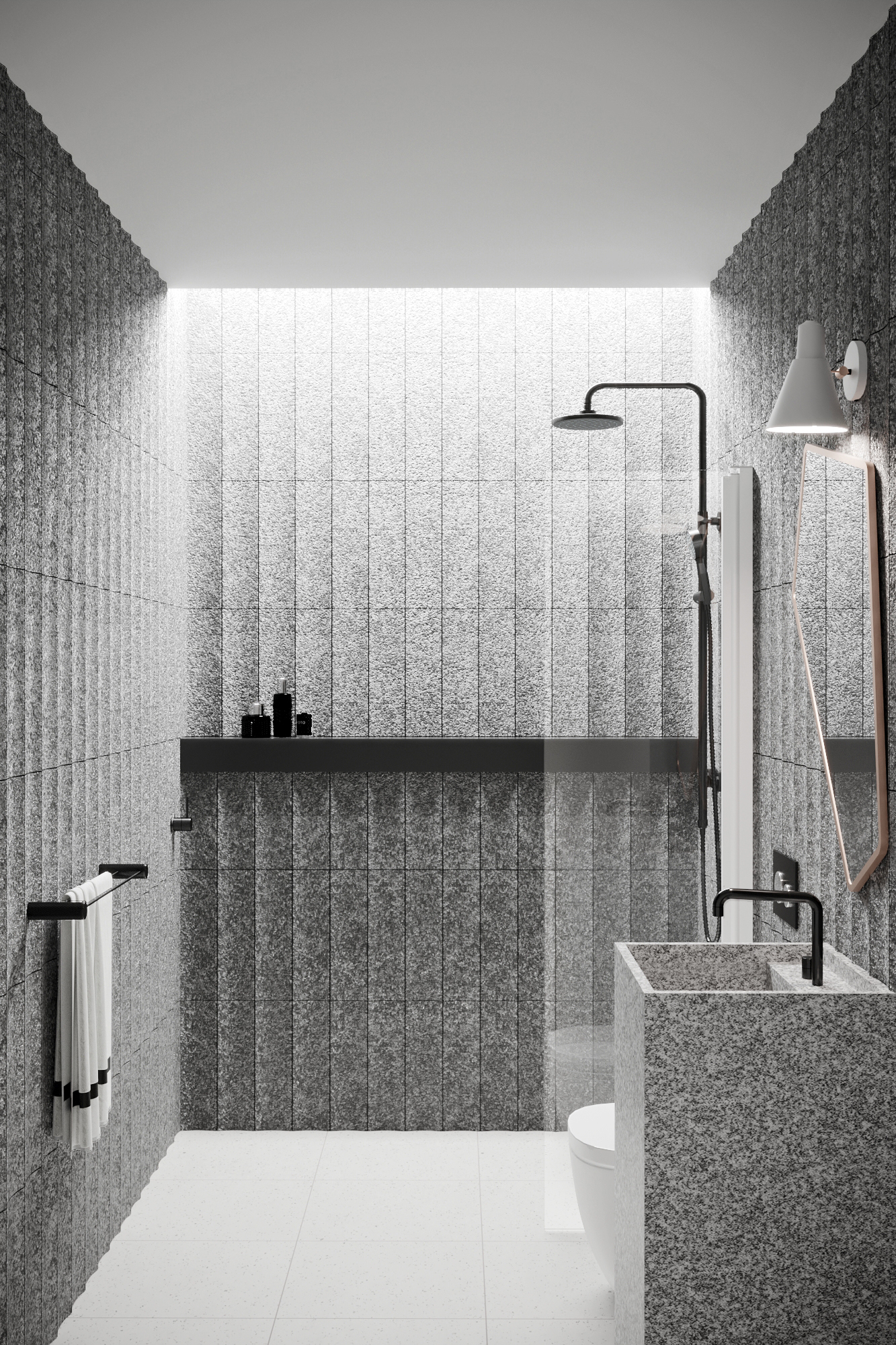 The hinged door protects the space and the fixture next to the shower from splashing water. When the shower is not in use, the shower screen can be turned against the wall of the building.