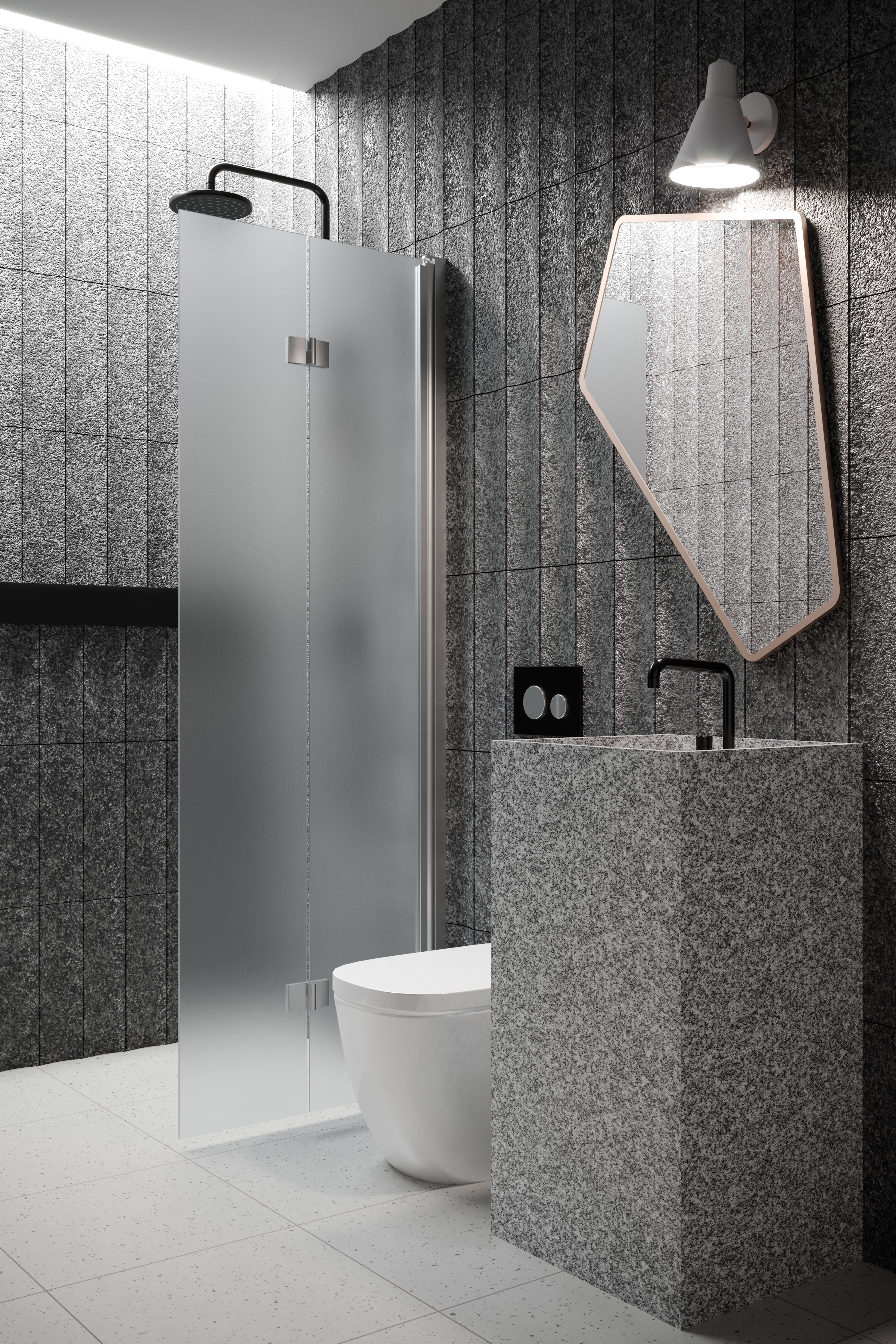 Folding shower screen protects the space and the fixture next to the shower from splashing water. When the shower is not in use, the shower screen can be folded into a small space against the wall of the building, inside the shower area.