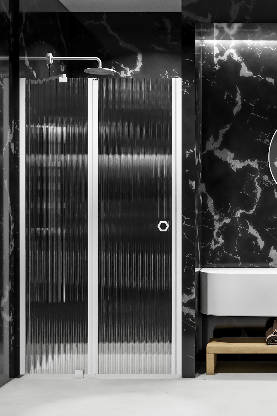 The product is manufactured of 6mm thick tempered safety panel (EN 12150). The safety panel can be treated in the factory with Cranith calcification prevention coating. The coating enables the panel to stay clean easier. Clear, superclear, grey and bronze are smooth surfaced and transparent glasses. Chinchilla, satin, greysatin, brownsatin, superclear satin and reeded glasses are not fully transparent, details cannot be made out through the panel. Chinchilla and reeded are textured on one side and smooth on the other side. One side of the satin panel is etched to acquire a velvety feel and the other side is smooth. When choosing one of the satin panel products, bear in mind that the etched surface of the panel is sensitive to scratches and stains. Please note, that productpictures use the super clear satin image, standard satin may tint more into green