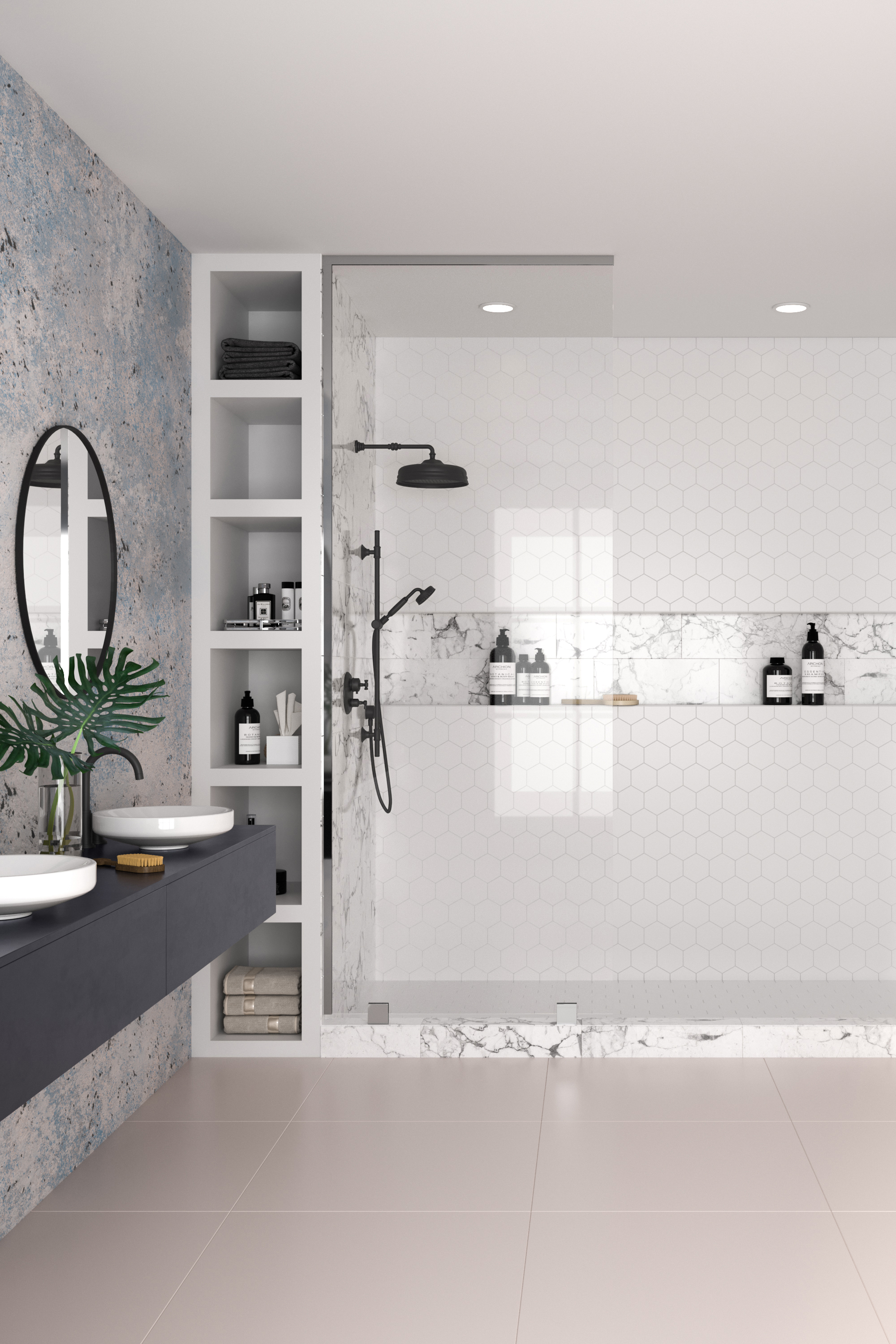 A partially framed shower wall consists of a glass panel, mounting frame profiles and floor clamps. The fixed panel is attached to the wall and the ceiling using stainless steel profiles, and to the floor with the help of floor clamps. The fixed shower screen is sturdy and can be efficiently used for protection from water.