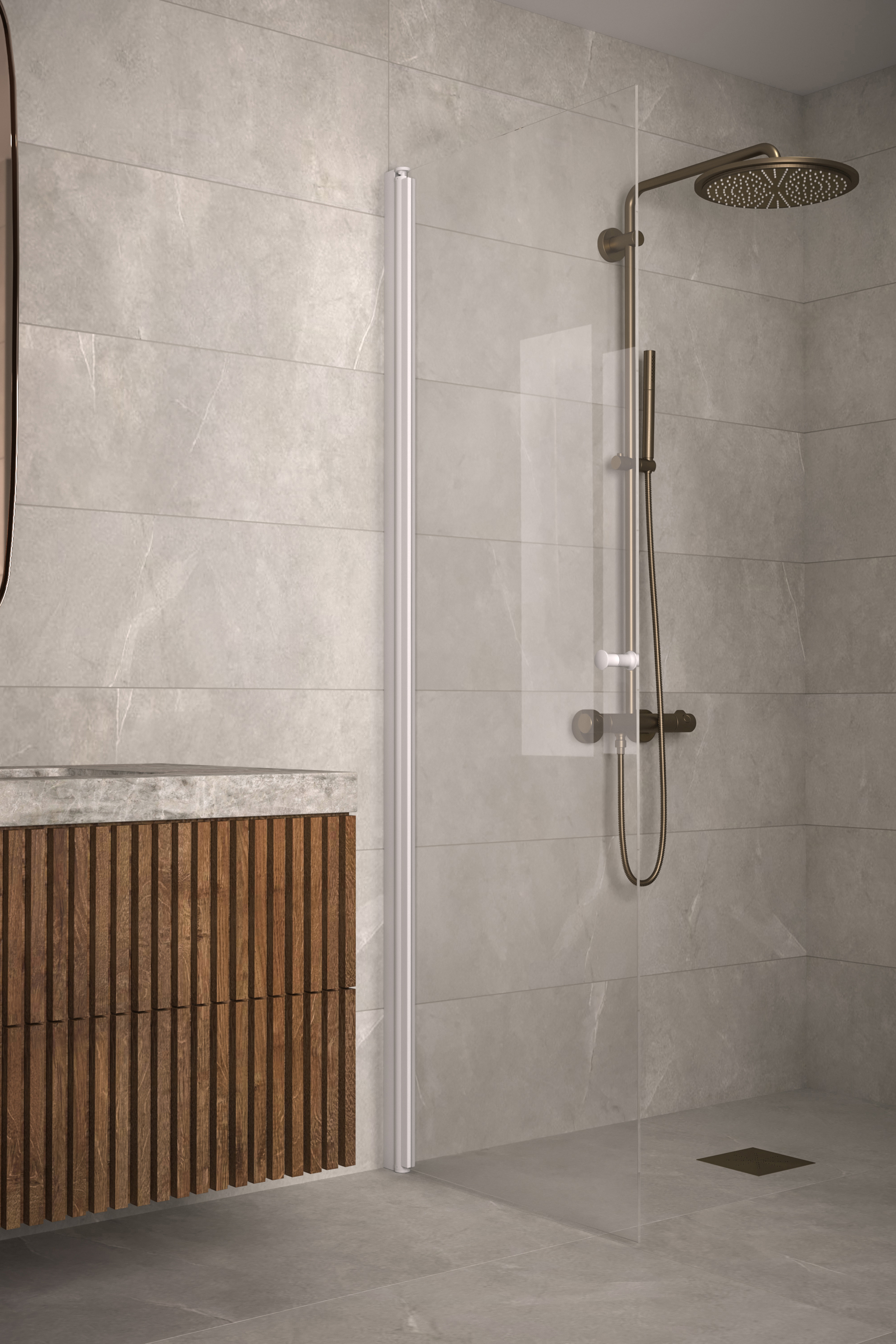 The shower screen is attached to the building wall with a wall mountedprofile. The installation height is freely selectable. By installing the product close to the floor and installing a floor seal along the bottom edge of the panel the flow of water can be restricted. Installation guide