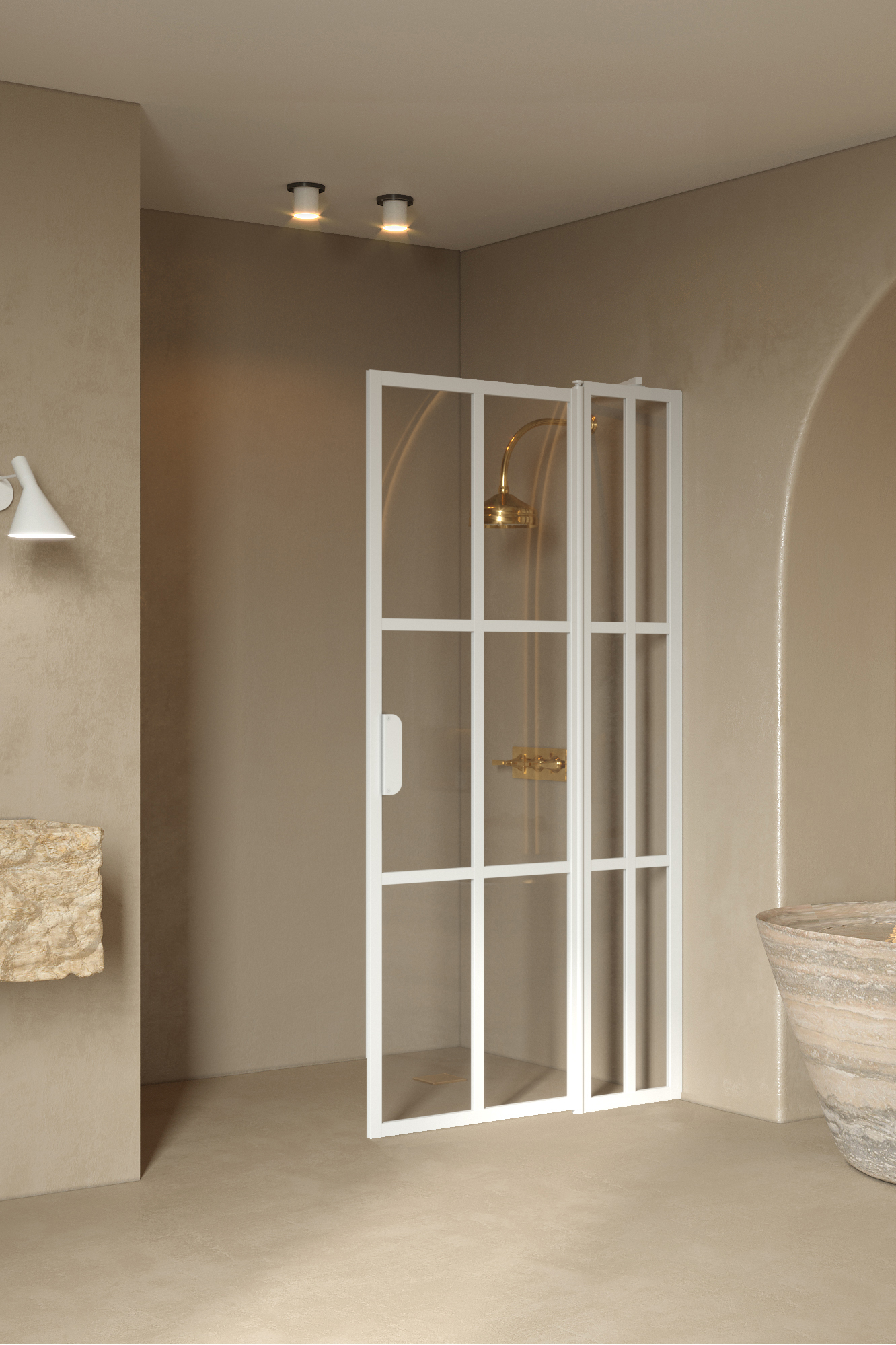 The white (RAL 9016), black (RAL 9005), Sand (RAL 1019), Mocha (RAL 8025) and Cocoa (RAL 8019) surface treatment options are manufactured by powder coating. The fittings used in the product, are made of painted brass alloy.