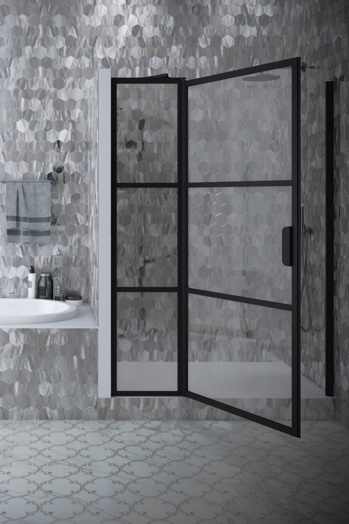 The swinging shower screen protects the space and the fixtures located next to the shower from splashing water. When the shower is not in use, the shower screen can be turned against the wall of the building.