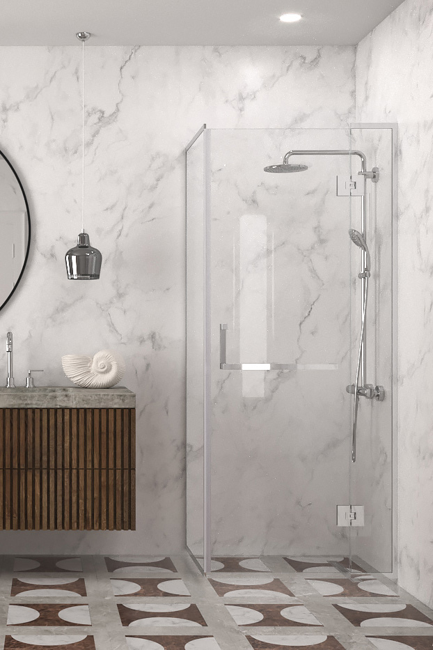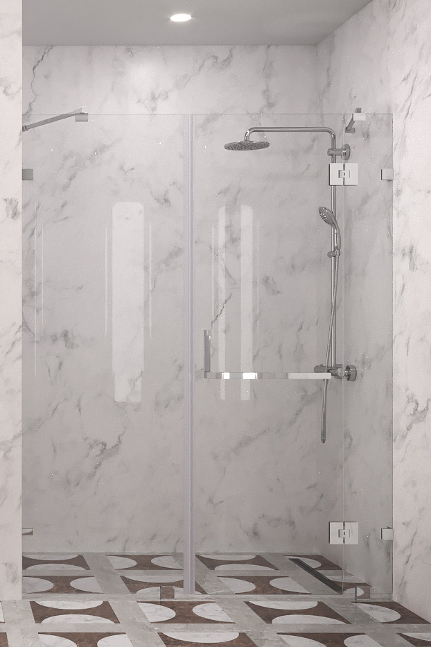 Tilanjakaja koostuu kahdesta kiinteästä seinästä, joista toiseen on saranoitu kääntyvä ovi. Tuote soveltuu hyvin suihkusyvennykseen, jonka ulkopuolella on kalusteita molemmin puolin. Kiinteät seinät voidaan mitoittaa kalusteiden syvyyksien mukaan niin, että avattaessa ovi ei törmää kalusteisiin.