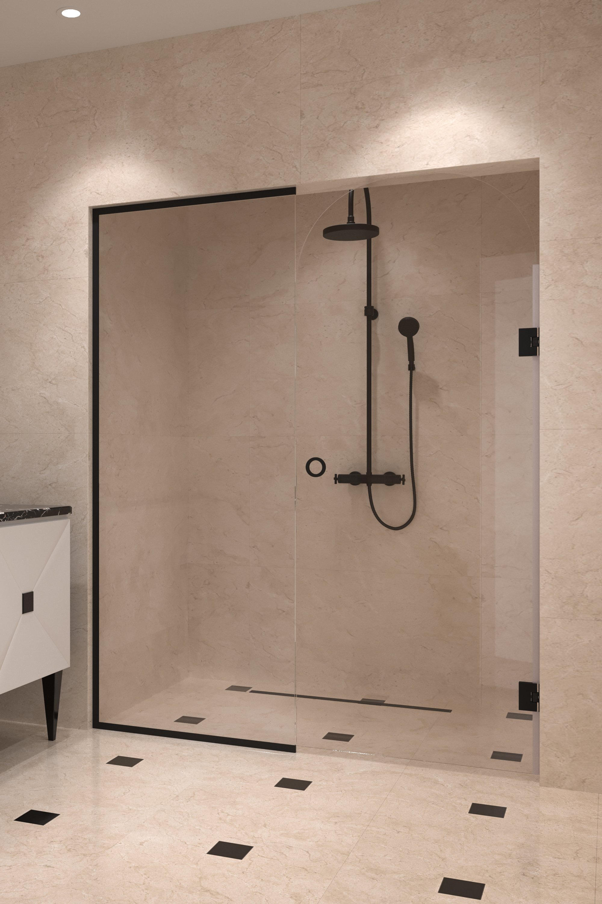 Tilanjakaja ovella koostuu kiinteästä seinästä ja kääntyvästä ovesta, jonka yläreuna on pyöristetty. Tuote soveltuu hyvin suihkusyvennykseen, jonka vieressä on kaluste. Kiinteä seinä ja ovi voidaan mitoittaa niin, että kiinteä suojaa kalustetta ja ovi on vapaaksi jäävän kulkutilan levyinen.