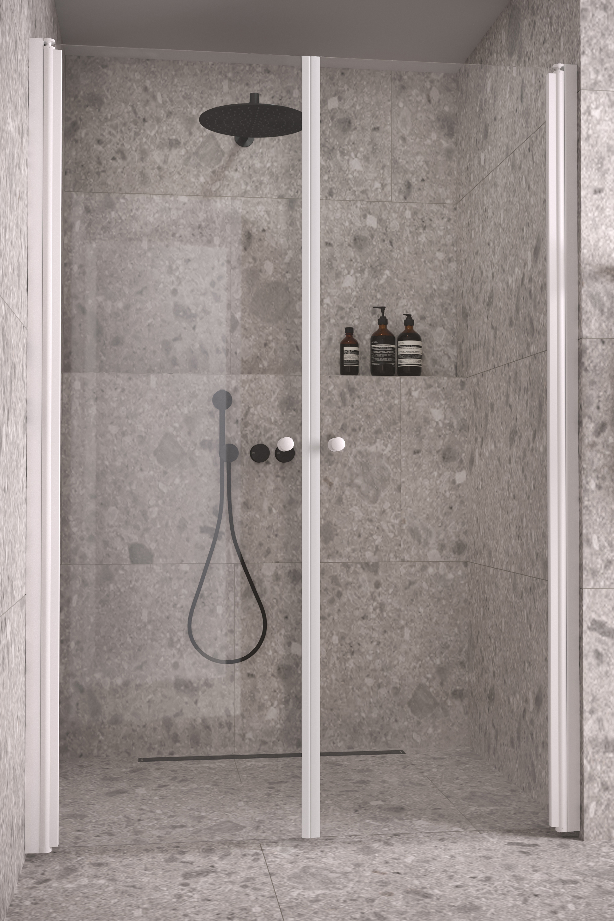 Tilanjakaja koostuu kahdesta kääntyvästä ovesta. Tuote soveltuu hyvin suihkusyvennykseen, jossa on tilaa ovien aukeamiselle joko suihkutilan sisä- tai ulkopuolella. Ovet voidaan mitoittaa symmetrisesti tai niin, että ovet ovat eri kokoiset. Kun suihku ei ole käytössä, ovet voidaan kääntää rakennuksen seiniä vasten.Ovet kääntyvät molempiin suuntiin 90 astetta ja varustetaan säädettävillä keskityksillä. Keskitys pyrkii palauttamaan ovet takaisin auki ja kiinni -asentoihin. Magneettitiivistepari pitää ovet tiiviisti suljettuna suihkun aikana.