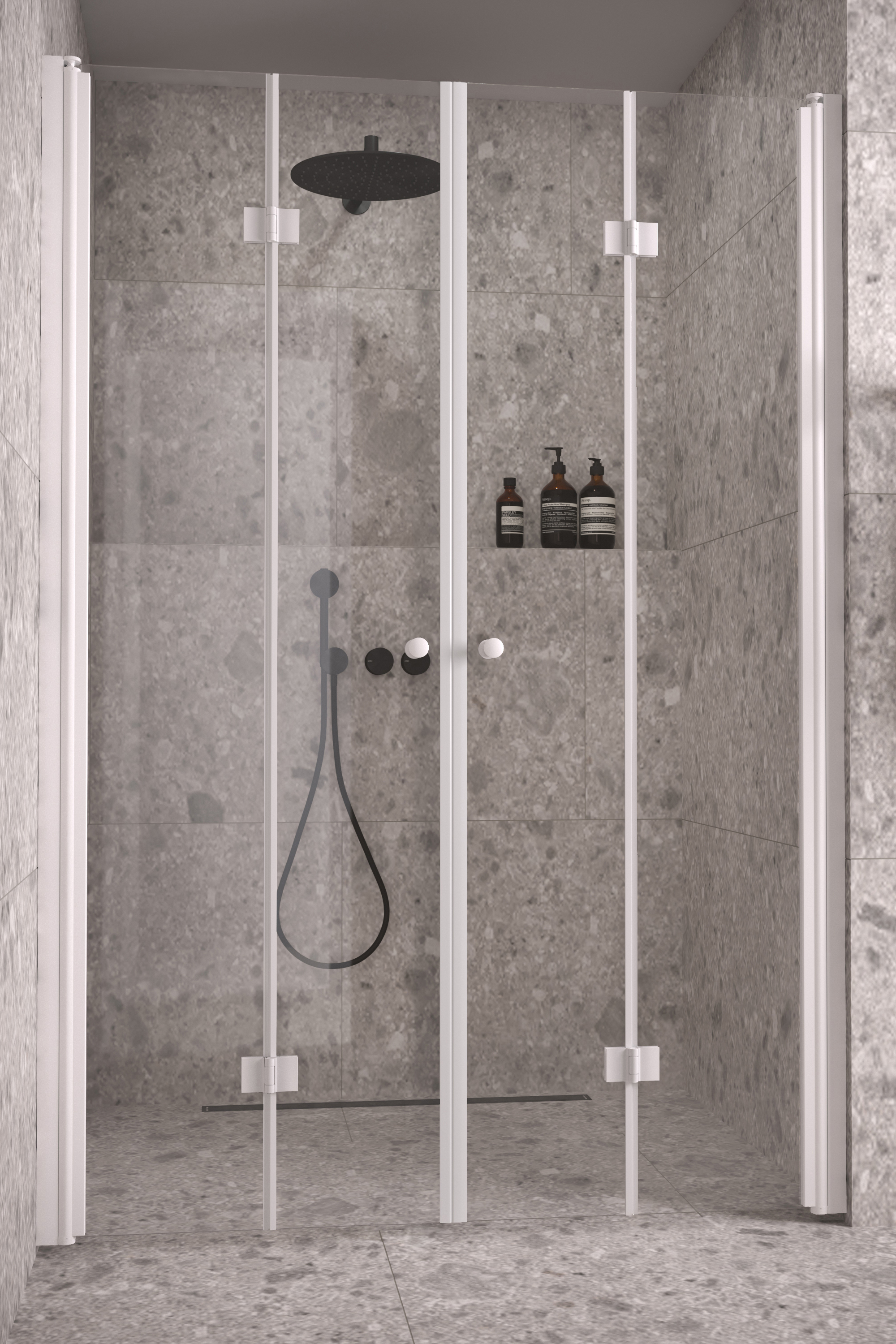 Tilanjakaja koostuu kahdesta taittuvasta ovesta. Tuote soveltuu hyvin suihkusyvennykseen, jossa ovet eivät välttämättä mahdu kunnolla avautumaan ulospäin. Taittuva ovi ei vaadi avautuakseen tilaa suihkutilan ulkopuolelta vaan ovi kääntyy taittaen suihkutilan sisään niin, että ovilasit laskostuvat pieneen tilaan rakennuksen seinää vasten. Ovet voidaan mitoittaa symmetrisesti tai niin, että ovet ovat eri kokoiset. Kun suihku ei ole käytössä, ovet voidaan kääntää rakennuksen seiniä vasten.Ovet kääntyvät molempiin suuntiin 90 astetta ja varustetaan säädettävillä keskityksillä. Keskitys pyrkii palauttamaan ovet takaisin auki ja kiinni -asentoihin. Uloimmat lasit kääntyvät lisäksi 180 astetta sisempiin laseihin nähden jolloin ovien lasit taittuvat toisiaan vasten suihkutilan sisäpuolelle. Magneettitiivistepari pitää ovet tiiviisti suljettuna suihkun aikana.