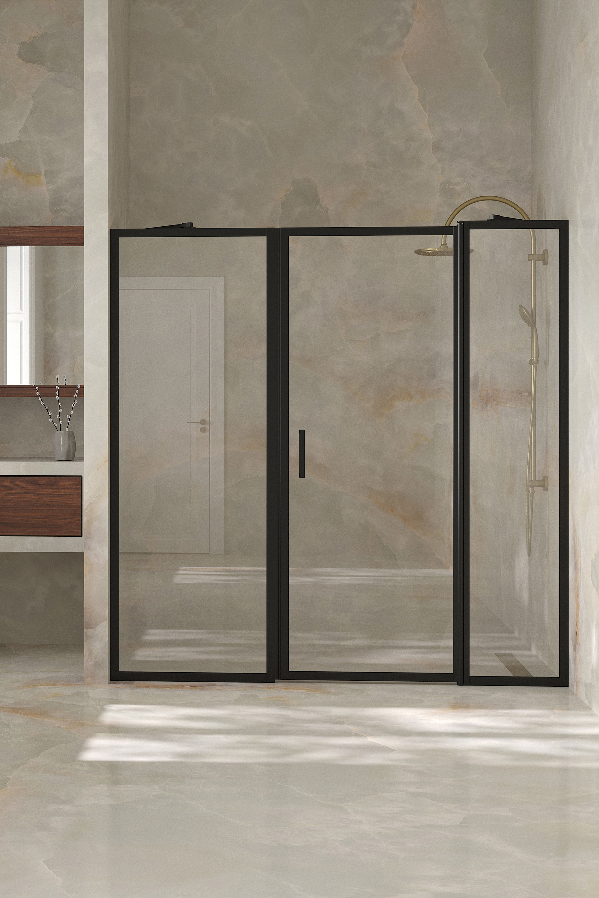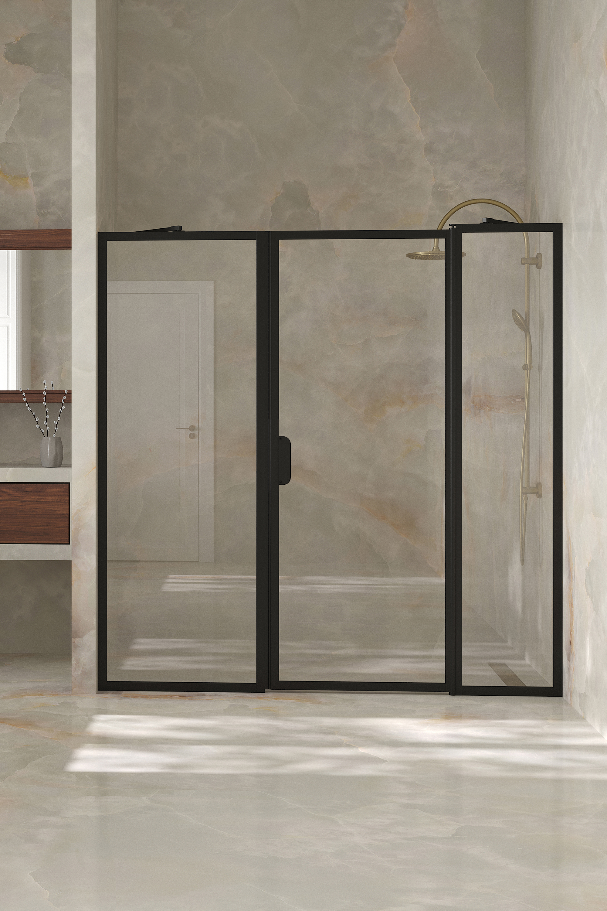 Tilanjakaja koostuu kahdesta kiinteästä seinästä, joista toiseen on saranoitu kääntyvä ovi. Tuote soveltuu hyvin suihkusyvennykseen, jonka ulkopuolella on kalusteita molemmin puolin. Kiinteät seinät voidaan mitoittaa kalusteiden syvyyksien mukaan niin, että avattaessa ovi ei törmää kalusteisiin.