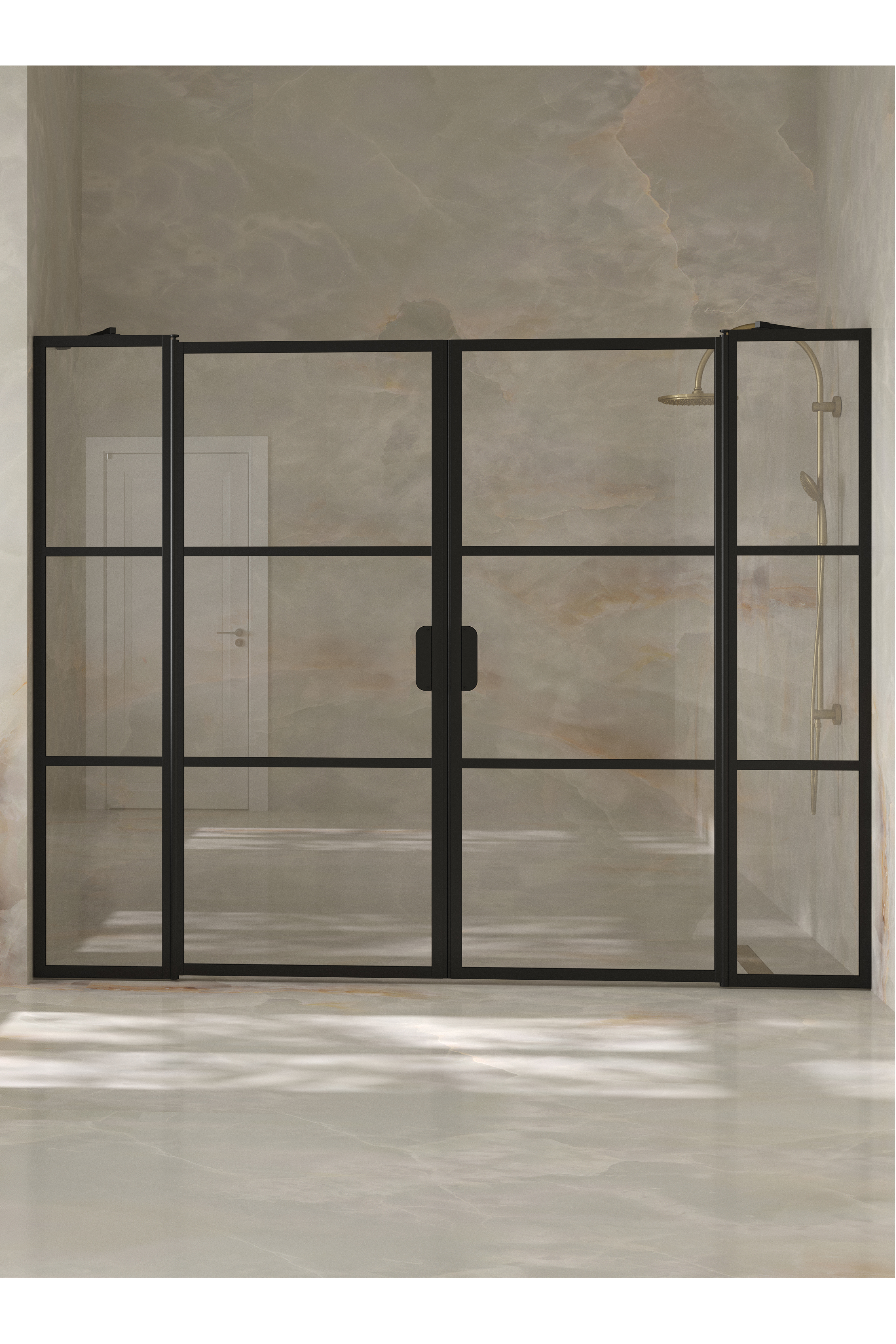 Tilanjakaja koostuu kahdesta kiinteästä seinästä joihin on saranoitu kääntyvät ovet. Tuote soveltuu hyvin suihkusyvennykseen, jonka ulkopuolella on kalusteita molemmin puolin. Kiinteät osat voidaan mitoittaa kalusteiden syvyyksien mukaan niin, että avattaessa ovet eivät törmää kalusteisiin. Ovet voidaan mitoittaa symmetrisesti tai niin, että ovet ovat eri kokoiset. Kun suihku ei ole käytössä, ovet voidaan kääntää rakennuksen seinien suuntaisesti.