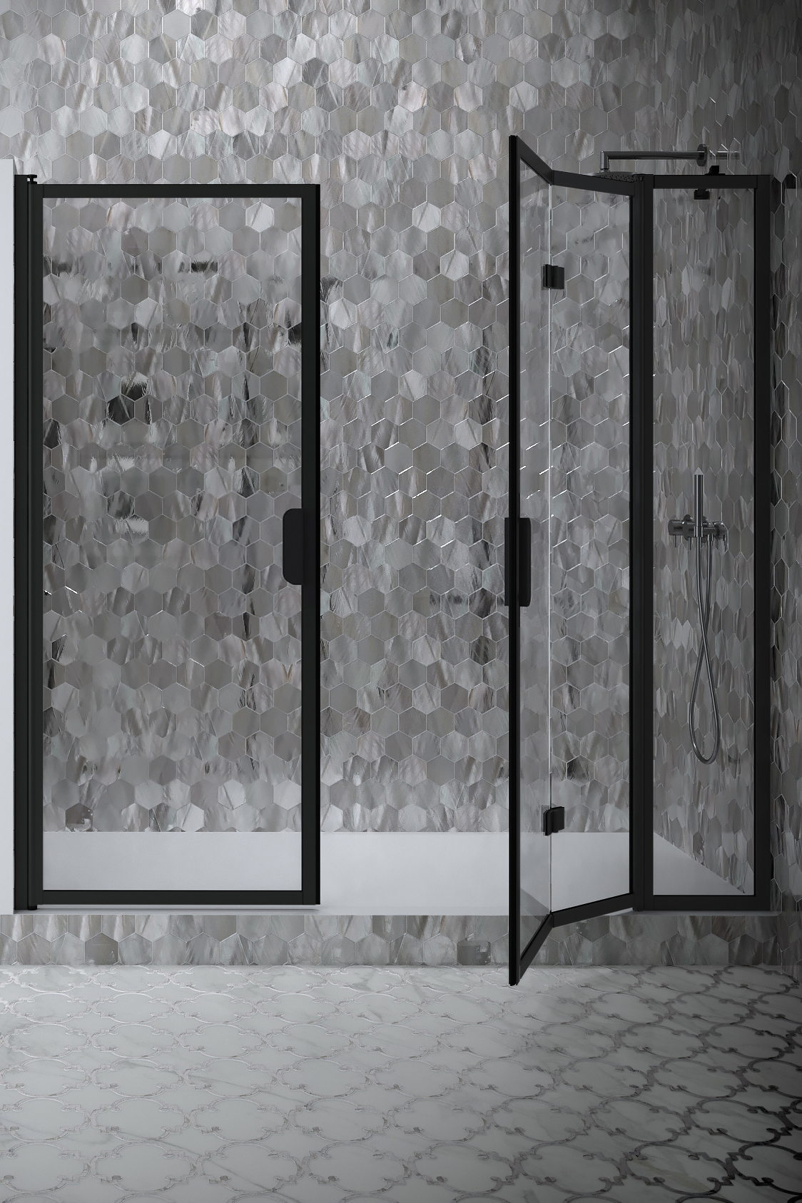 Tilanjakaja koostuu kääntyvästä ovesta ja kiinteästä seinästä johon on saranoitu taittuva ovi. Tuote soveltuu hyvin suihkusyvennykseen, jonka toisella sivulla tila on ahdas sekä suihkutilan ulko- että sisäpuolella. Taittuva ovi ei vaadi avautuakseen tilaa suihkutilan ulkopuolelta vaan taittuu pieneen tilaan suihkutilan sisälle rakennuksen seinän suuntaisesti. Kiinteä seinä voidaan mitoittaa suihkutilan sisäpuolella olevan kalusteen (esim. sekoittaja) mukaisesti niin, että ovi ei taittuessaan osu kalusteeseen. Ovet voidaan mitoittaa symmetrisesti tai niin, että ovet ovat eri kokoiset. Kun suihku ei ole käytössä, ovet voidaan kääntää rakennuksen seinien suuntaisesti.