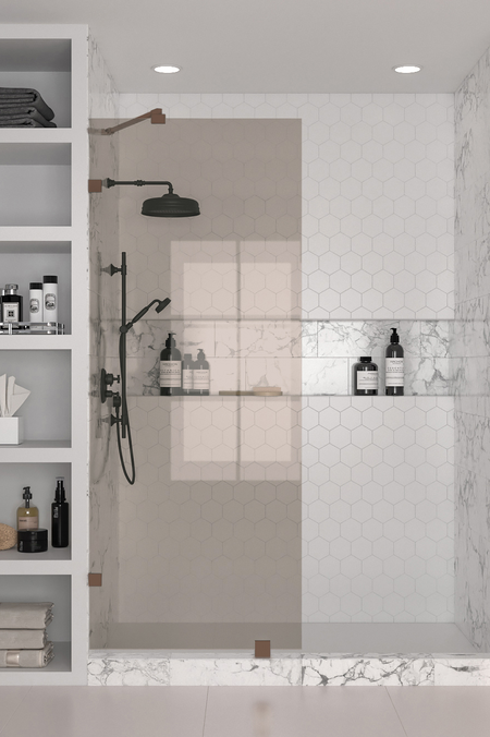 Glasvägg med fasta paneler på gångjärnssidorna, pardörr och övre fönster